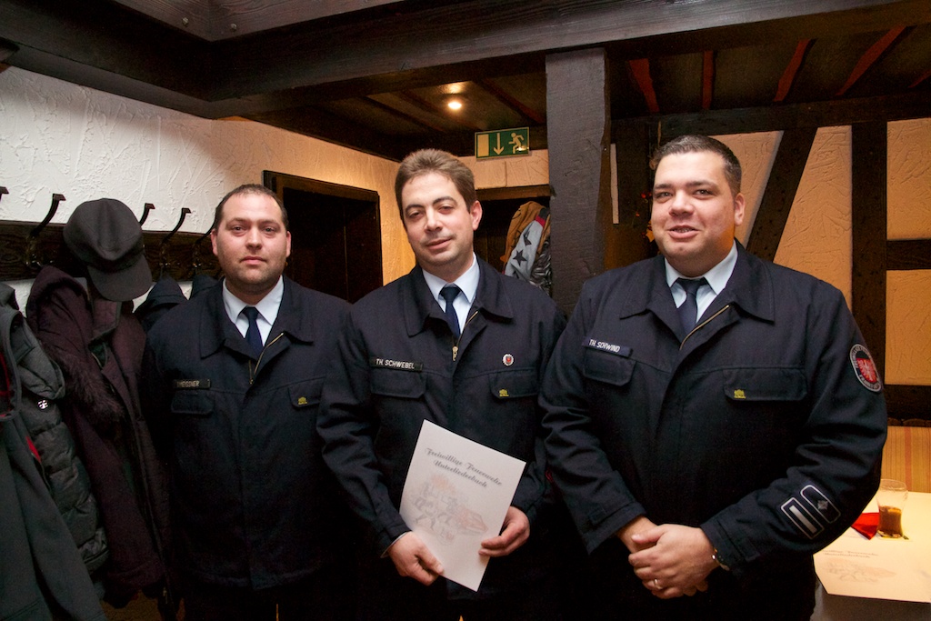 In diesem gemütlichen Rahmen führte der Wehrführer, Thomas Schwind, die Anwesenden durch ein ereignisreiches Jahr 2013 mit beindruckenden Leistungen und Einsatz der Kameraden. So wurden bis jetzt mehr als 2000 Stunden in Übung und Unterricht gesteckt, 53 Lehrgänge auf Stadt und Landesebene von allen Aktiven besucht, sowie 12 Alarmierungen mit teilweise mehreren Einsätzen dabei gemeistert. Nach einer Stärkungspause ging es mit den Beförderungen und Ehrungen weiter.